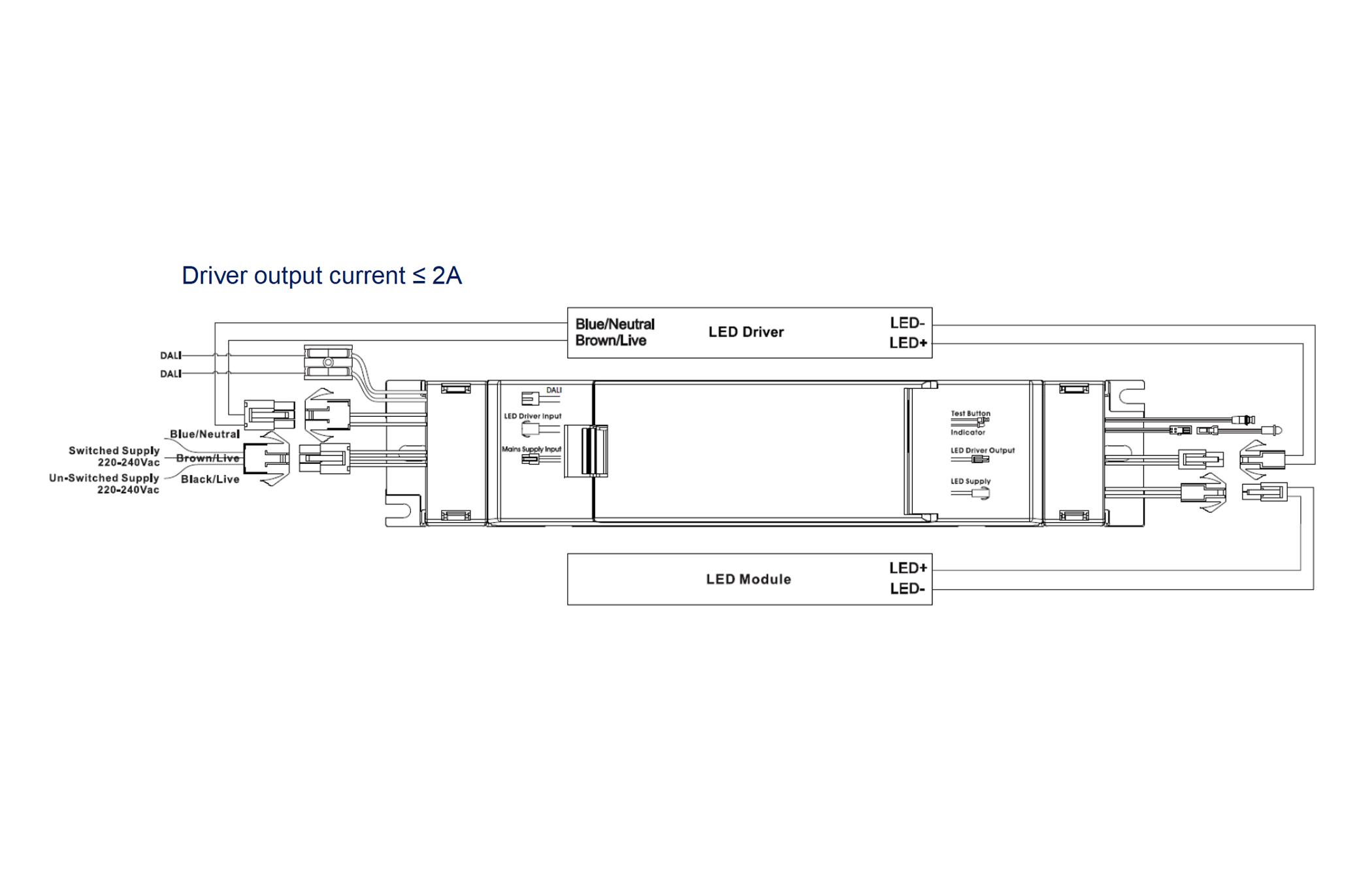 - Wired between driver and LED module via internal terminals or wire leads
