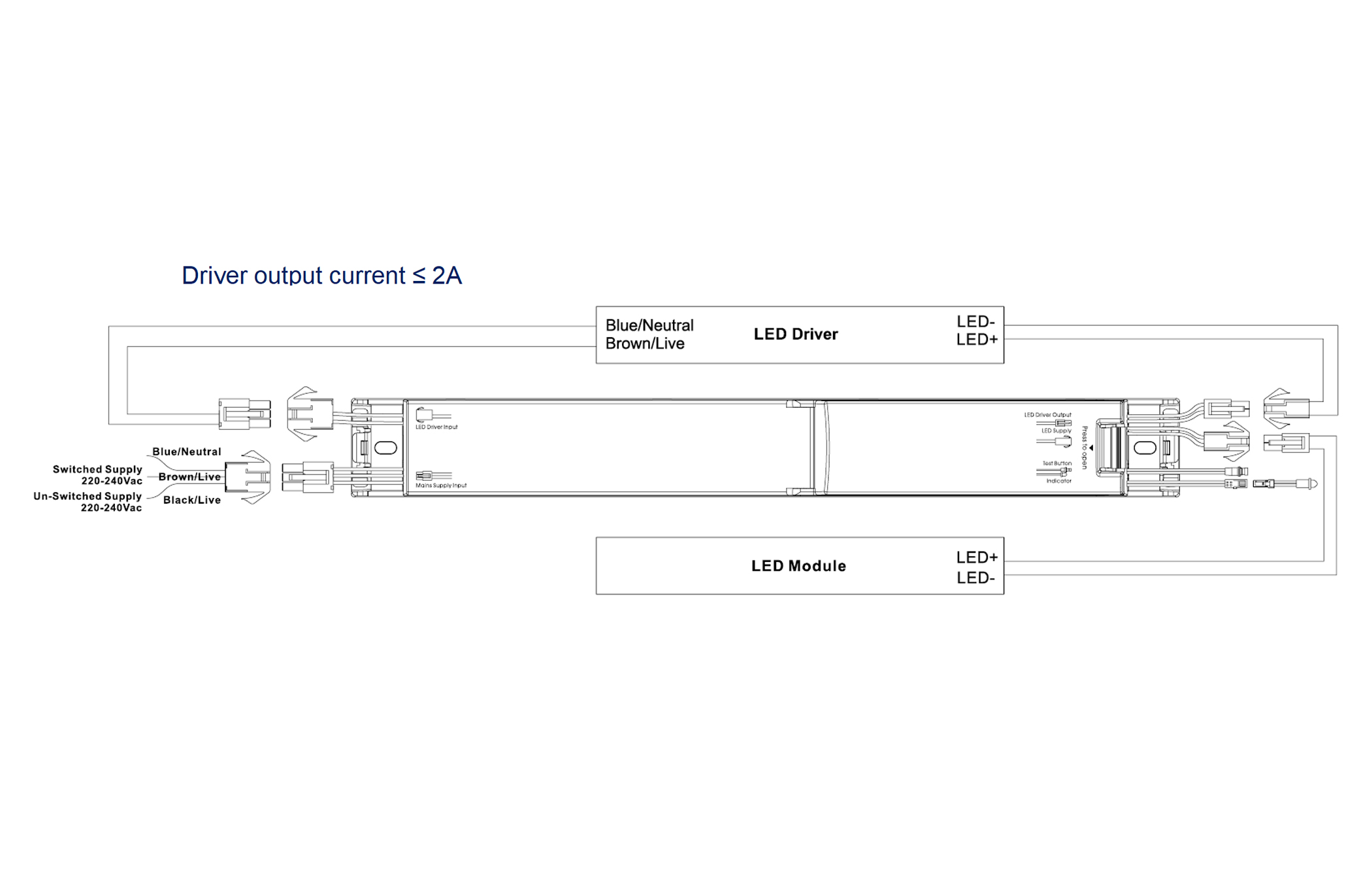 - Wired between driver and LED module via wiring leads with connector
