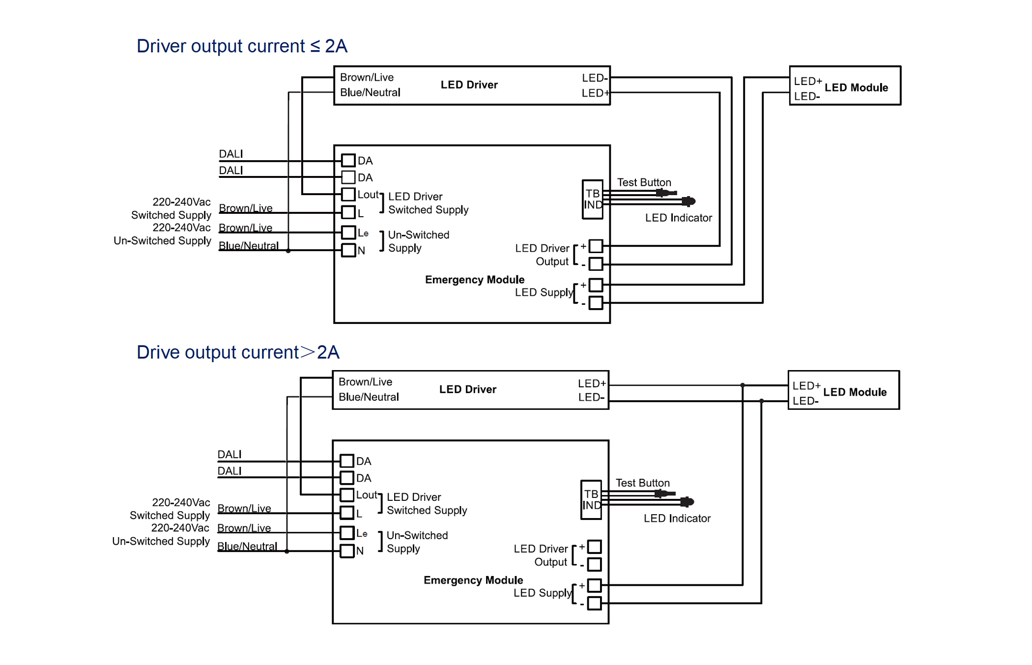 - Wired between driver and LED module via wiring leads with connector