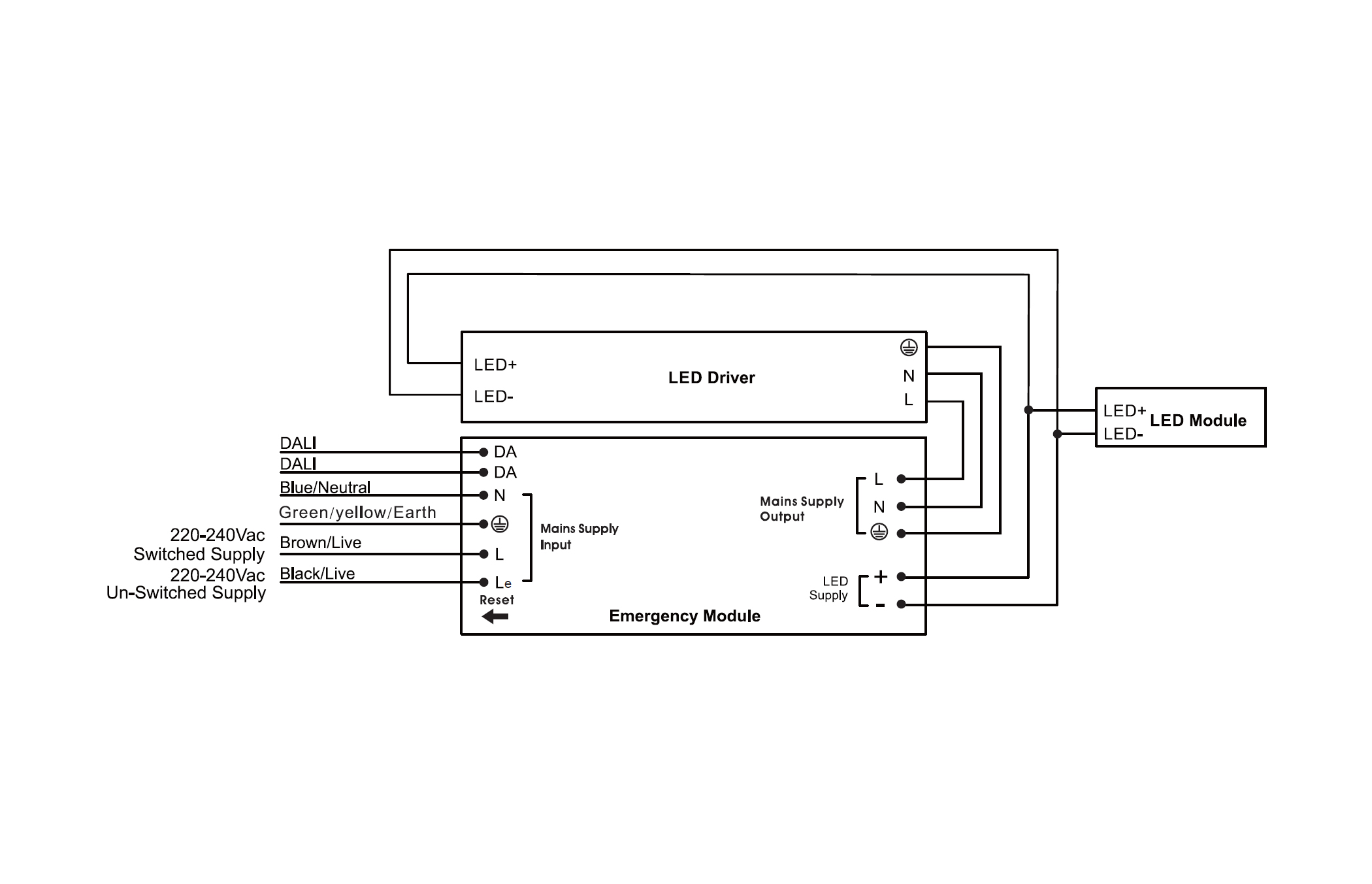 - Wired between LED module and emergency module via water-proof connector